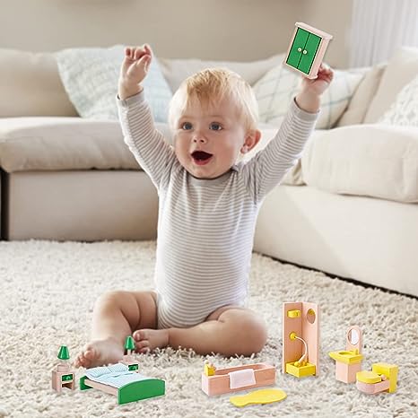 765 денМебел за дрвена кукла за кукли, комплети за мебел за мини куќичка за кукли Дрвен минијатурен мебел за преправање играчки за симулација на семејни кукли Сет за играње за деца Куклена куќа, додаток за кукли