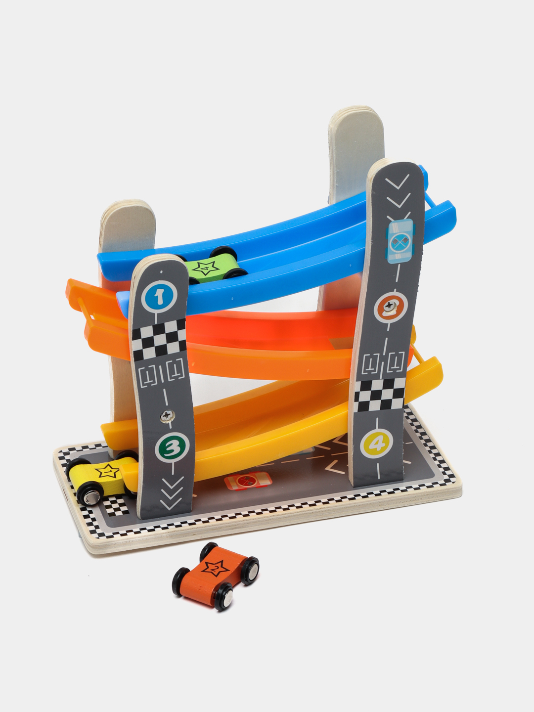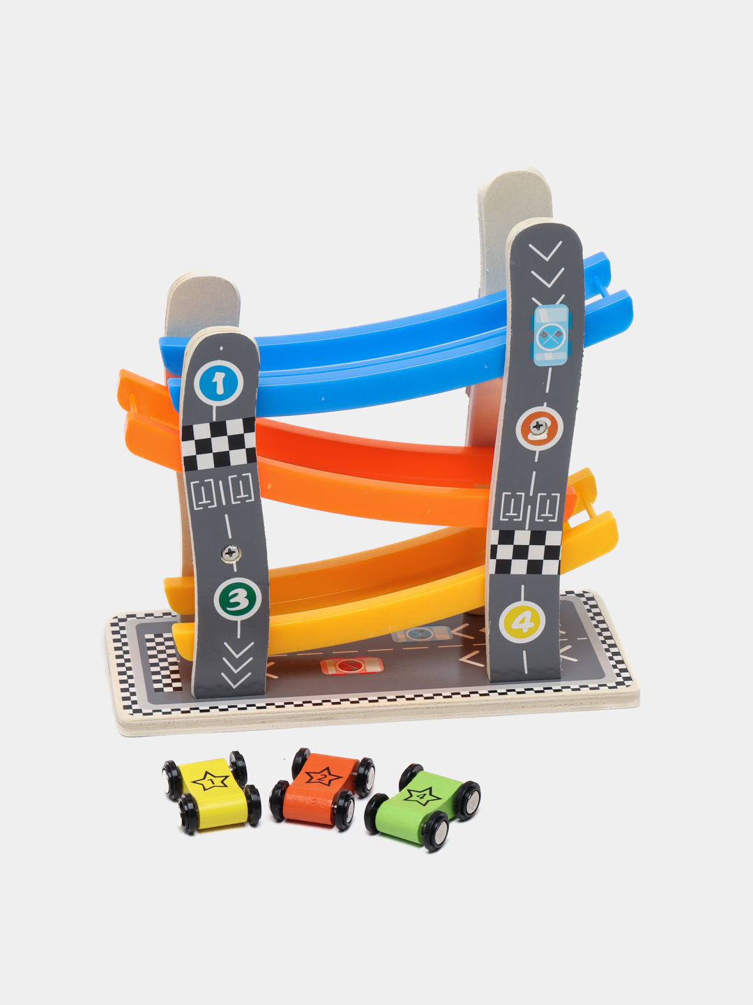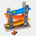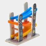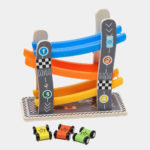Дрвени играчки за тркачки патеки со автомобилски тркач со рампа со 4 мини автомобили Промовираат координација на рака и очи Детски играчки Едукативни игри за деца