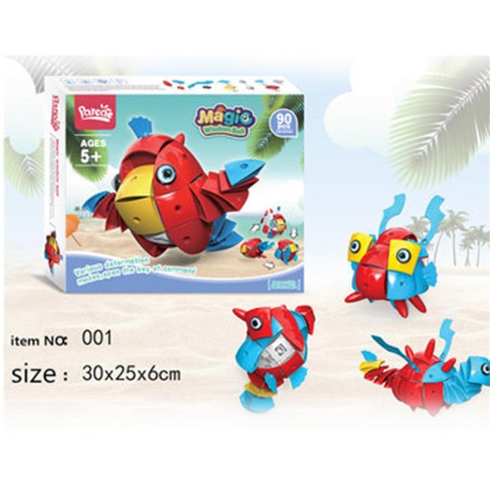 Сетот е составен од коцки за градење на папагал, пингвин и риба.