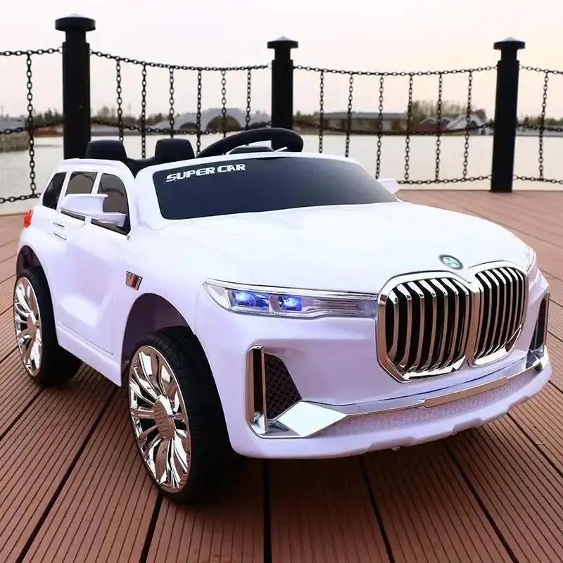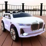 Бел електричен автомобил за деца, со модерен дизајн инспириран од луксузни SUV модели.
