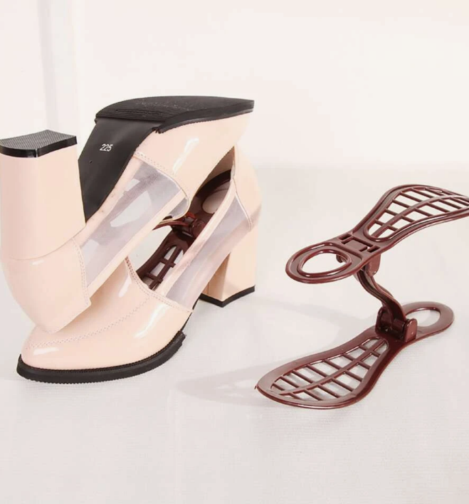 Држачот се пушта и собира и не зафаќа голем простор. Предноста на овој држач е тоа што овозможува да се редат чевлите една врз друга со што се добива на простор.