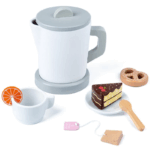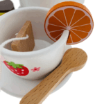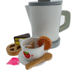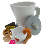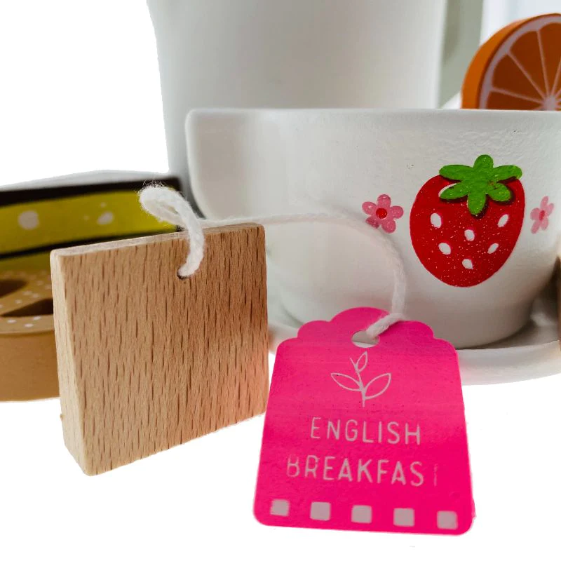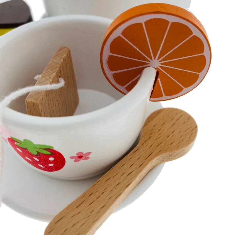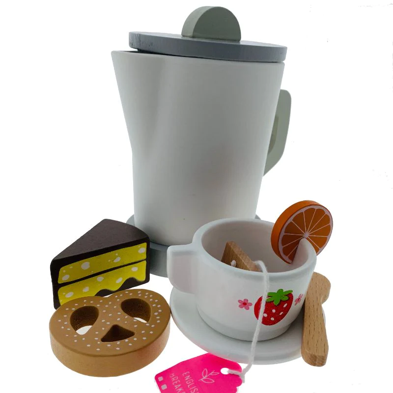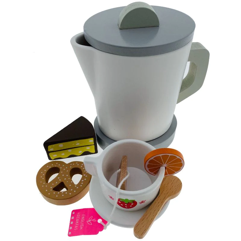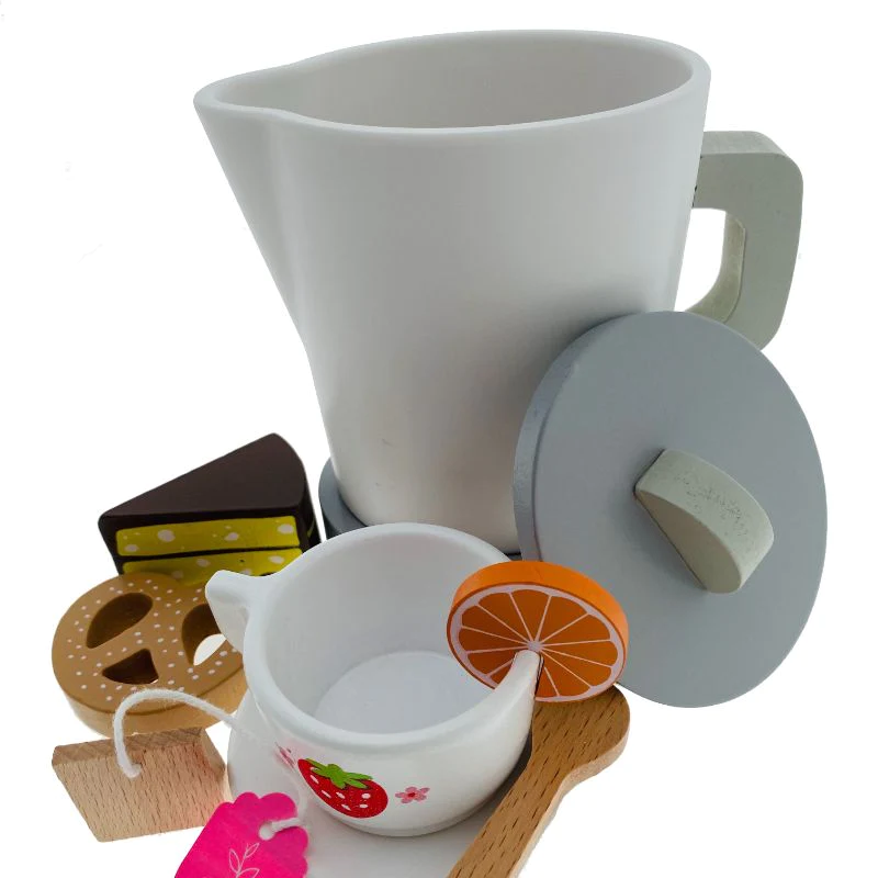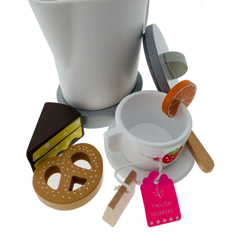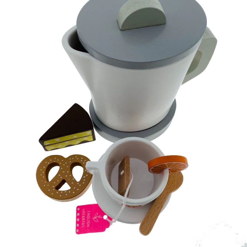 Сет за играње со дрвен чајник за чај. Играчка за храна за кујна.