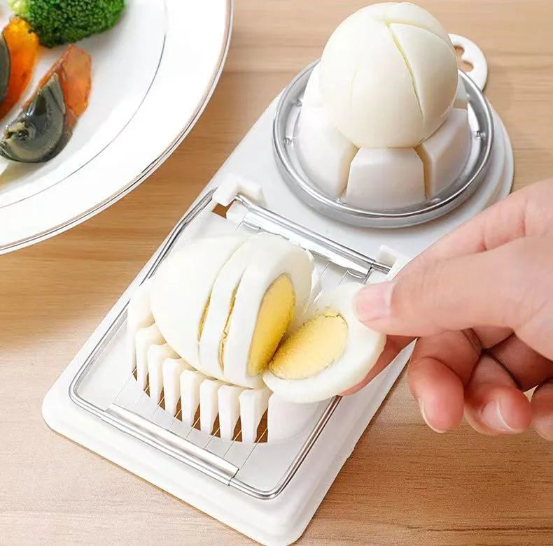 Практична алатка за сечење јајца, изработена од цврста ABS пластика. Има два начини на сечење за добивање различни форми. Едноставно за користење, се става јајцето врз калапот и со горниот дел за сечење се претиска. За миг го сечете јајцето на неколку делови и веднаш можете да зачинувате, декорирате и.т.н.