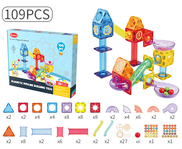 109 парчиња градежни блокови може лесно да се комбинираат во различни форми за да се поттикне детската имагинација и практична способност. Од 2Д едноставен број до 3Д геометрија